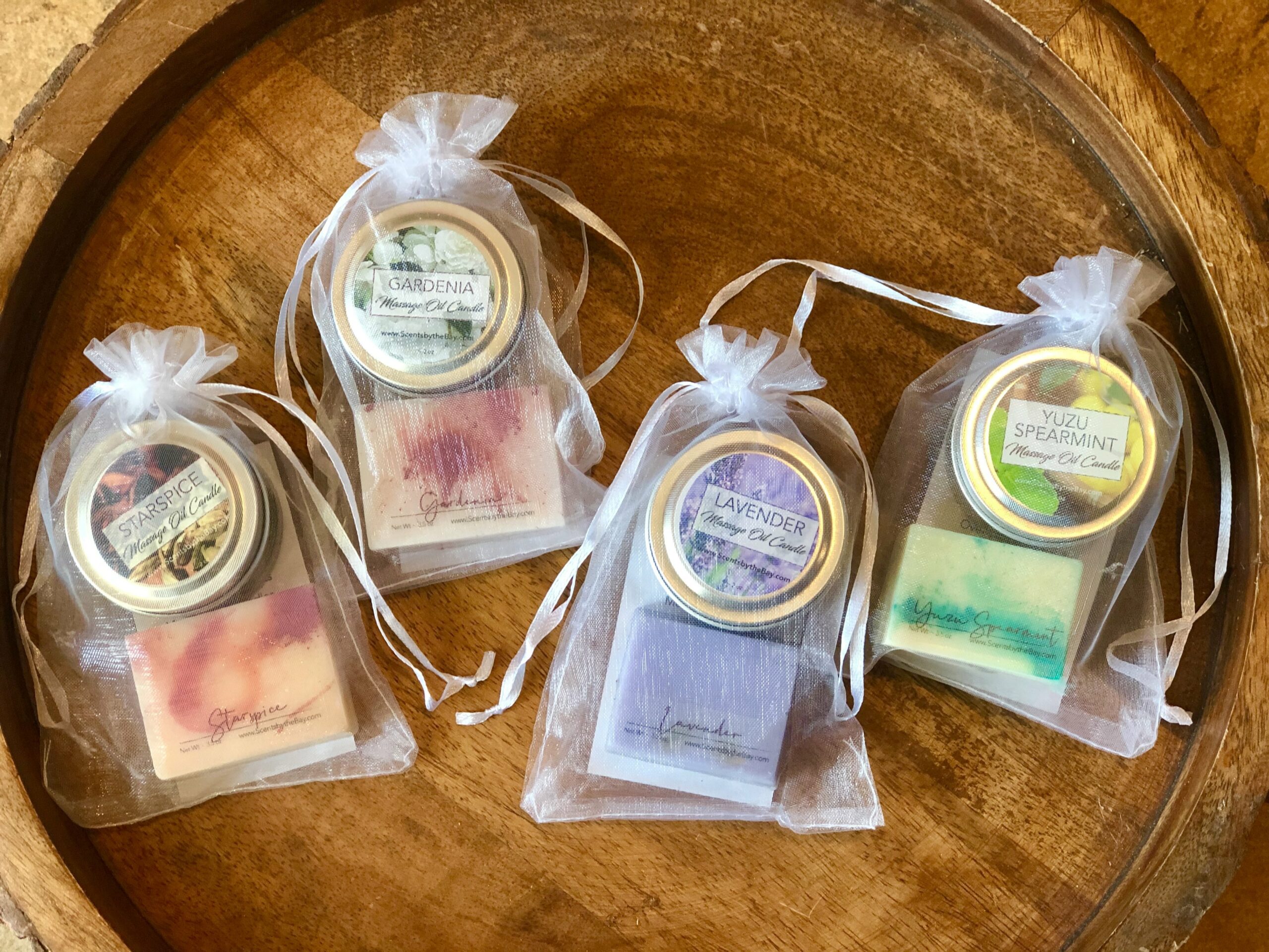 A perfect little luxury for clients, employees, or event favors. Each set includes a Massage Oil Candle, a matching Handcrafted Soap , a bamboo spoon, and a candle care card, all beautifully packaged.